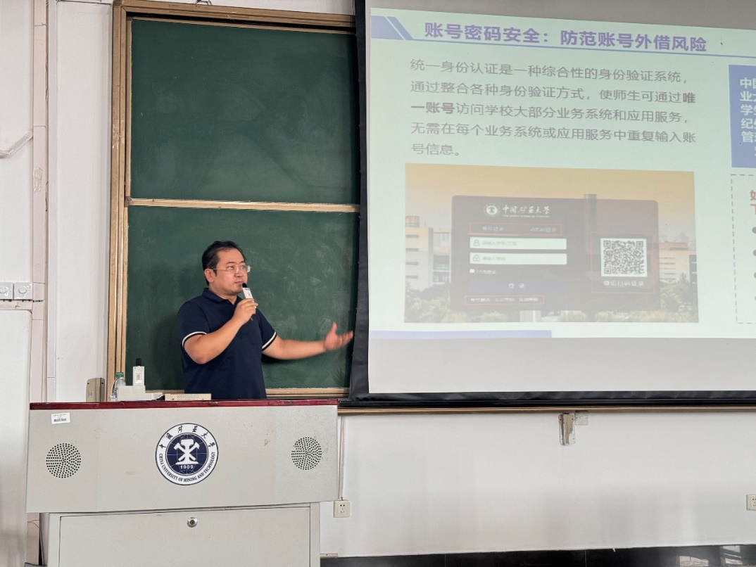 在网络安全教育讲座上,苏昕老师从电影《孤注一掷》说起,围绕“账户密码安全、邮件安全、终端安全”三大板块展开陈述。他强调,网络安全绝非小事一桩,而是关乎每位同学个人信息保护、学习生活秩序乃至社会稳定的大事。他鼓励每一位在座的新生都要树立起强烈的自我保护意识,主动承担起网络安全的第一道防线责任,不仅要严格遵守学校制定的网络安全管理规定,更要积极学习并掌握必要的应对技能,以便在遭遇网络威胁时能够迅速有效地采取措施,保护自身免受侵害。