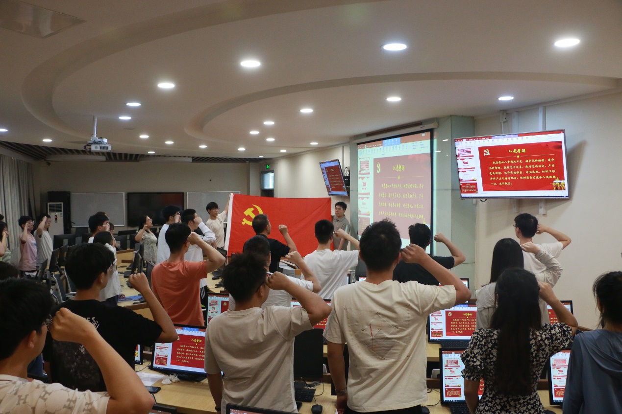 党课结束后,与会党员面向党旗重温入党誓词。