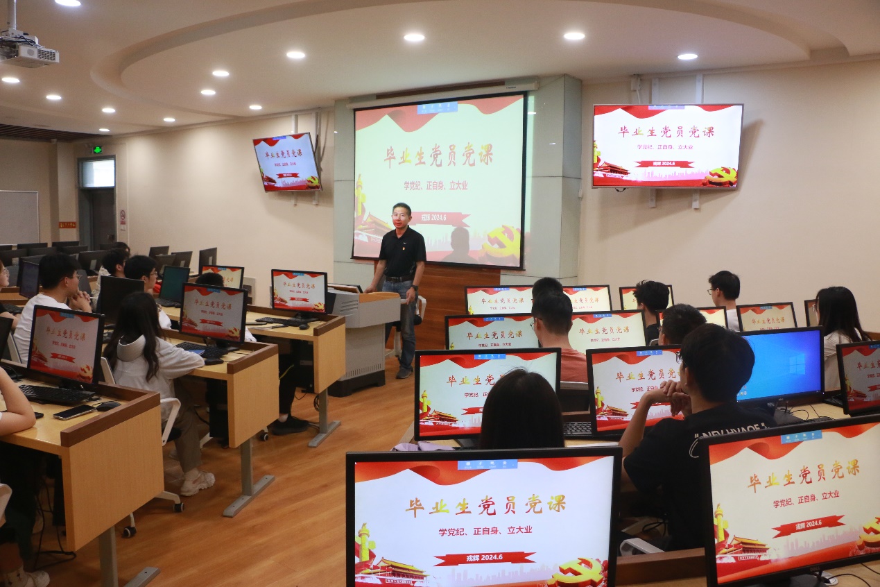 6月4日下午,数学学院举行2024届毕业生党员专题党课。数学学院党委书记戎辉以“学党纪、正自身、立大业”为题讲授党课,学院学工办主任卫慧芳、专职辅导员郑硕、2024届毕业生党员参加党课。