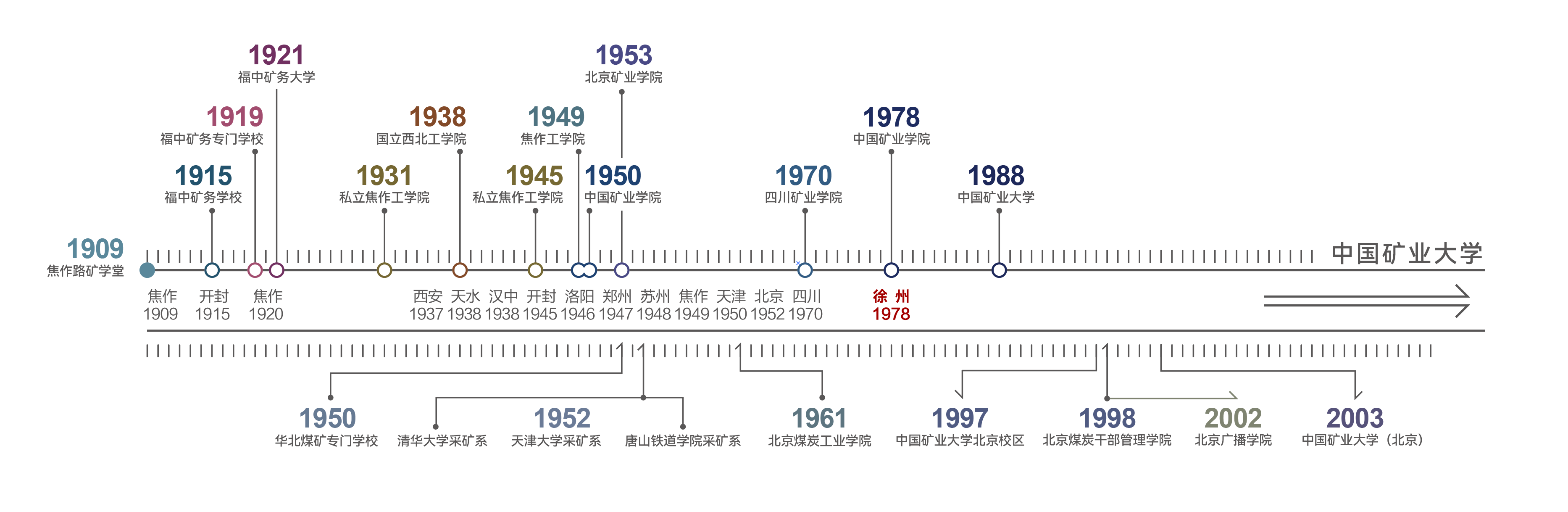 中国矿业大学肇始于1909年创办的焦作路矿学堂。1931年,更名为私立焦作工学院。抗战爆发后,1938年西迁陕西城固,与东北大学工学院、北平大学工学院、北洋大学工学院联合组建国立西北工学院。抗战胜利后,几经辗转,于1949年9月迁回焦作原址。1949年12月,焦作工学院拨归当时的燃料工业部领导。1950年3月,更名为中国矿业学院。1951年4月,学校从焦作搬迁至天津办学。1952年,北洋大学、唐山交大、清华大学的采矿系调整到中国矿业学院。1953年,学校迁至北京,改称北京矿业学院,成为北京学院路著名的“八大学院”之一。1970年,学校迁至四川省合川县三汇坝镇,更名为四川矿业学院。1978年,学校开始搬迁至江苏徐州办学,恢复中国矿业学院校名,并在北京学院路原校舍设立中国矿业学院北京研究生部。1988年,学校更名为中国矿业大学,邓小平同志亲笔为学校题写了校名。1997年,中国矿业大学北京研究生部改设为中国矿业大学北京校区。1998年,原煤炭工业部撤销,学校划归国家煤炭工业局管理。2000年,学校整体划转教育部直属管理。2003年,中国矿业大学北京校区从中国矿业大学独立出去,命名为中国矿业大学(北京),至此,中国矿业大学和中国矿业大学(北京)成为两个相互独立的办学实体。2004年,学校成为国家批准设立研究生院的56所高校之一。1997年学校成为国家“211工程”重点建设高校,2006年成为“985优势学科创新平台项目”建设高校,2017年成为“双一流”学科建设高校。2022年,教育部、应急管理部和江苏省人民政府共建中国矿业大学。